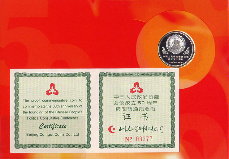 背面主景图案为全国政协会徽,会徽两旁有装饰花瓣,内缘下方依次为中 国人民政治协商会议胜利50周年字样及“1949-1999”年号。[关闭窗口] - ::商品简介::