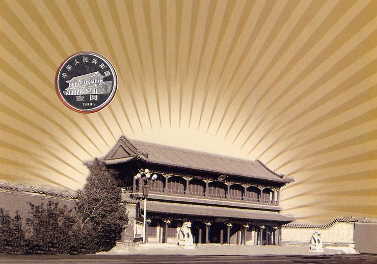 年 号 面 值重 量直 径材 质1999 1元6.0525毫米钢芯镀镍质 量装帧 制造厂所属类别 精制20000套 上海造币厂铸造 流通纪念币 简介正面主景图案为全国政协第一届会议会址——中南海新华门,内缘上方为 “中华人民共和国”字样,下方依次为“壹元”字样及“1999”年年号。