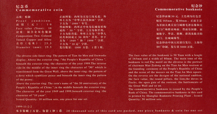 - 庆祝中华人民共和国成立50周年普通纪念币(精制)庆祝中华人民共和国成立50周年纪念钞和中华人民共和国成立50周年普通纪念币(精制)[关闭窗口]