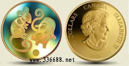 金币由18K金铸造,采用幻彩工艺,成色为75%金、25%银,重量11.84克,直径28毫米,面额150加元,质量精制,发行量4,888枚。其正面图案为伊丽莎白二世女王肖像,外圈铭字“加拿大 2008 伊丽莎白二世 150元”,背面图案为全身布满各种图案的一对老鼠。