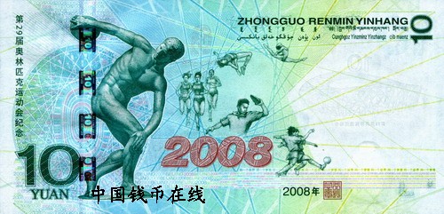 该纪念钞背面主景图案为古希腊雕塑“掷铁饼者”、运动员群像图案及“2008”字样。主景图案下方为年号“2008”及行长印章。票面左侧为“第29届奥林匹克运动会纪念”、面额数字“10”、汉语拼音“YUAN”字样及光变全息开窗安全线;票面右上方为“中国人民银行”汉语拼音行名及蒙、藏、维、壮四种民族文字的“中国人民银行”字样和面额。