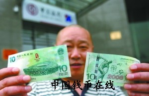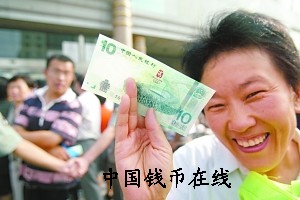 | 昨日,方庄一银行外,一位市民展示刚兑换到的奥运纪念钞。当日8时30分起,5家商业银行在京的约300网点开始兑换奥运纪念钞,仅半小时,所有纪念钞被抢兑一空。不少人从前晚开始全家出动排队兑换。当日下午,面值10元的奥运纪念钞在市场上甚至被炒到1000元一张。戚连民 摄 |