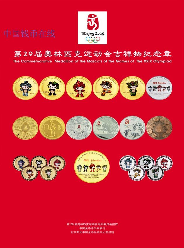 经北京奥组委授权,中国金币总公司于近日发行了第29届奥林匹克运动会吉祥物纪念章(以下简称“纪念章”)一套。该套纪念章设计精美,分别以金、银、铜三种金属为载体,将吉祥物组合图案和单个图案生动地刻画出来。