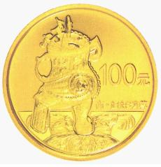 5盎司圆形金质纪念币背面图案为商代司母辛方鼎,衬以该器物兽面纹样等装饰组合设计,并刊“商·司母辛方鼎”字样及面额。