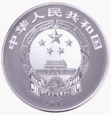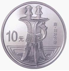 1公斤圆形银质纪念币背面图案为商代妇好偶方彝,衬以该器物凤鸟纹样装饰组合设计,并刊“商·妇好偶方彝”字样及面额。