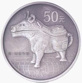 5盎司圆形银质纪念币背面图案为商代司母辛觥,衬以该器物典型纹样装饰组合设计,并刊“商·司母辛觥”字样及面额。