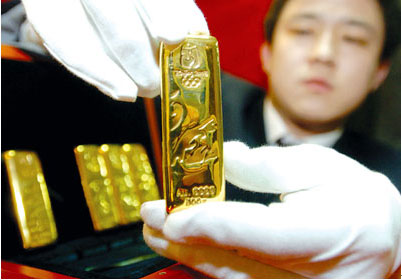 12月14日,中国印钞造币总公司的工作人员展示即将面市的“北京奥运金”本色系列第二组。据了解,“北京奥运金”本色系列将分5次连续发行,5根金条上的图案拼合后可组成“2008”完整图形,其第一组已于今年2月发行。(新华社)