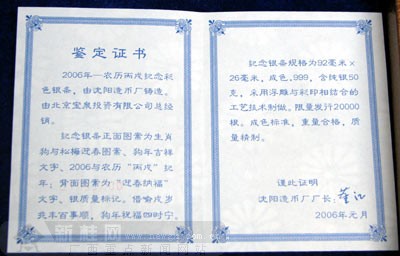 2006—农历丙戌纪念彩色银条同时附有沈阳造币厂的鉴定证书。记者蒙卫芝摄