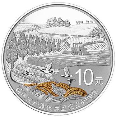 31.104克(1盎司)圆形银质纪念币背面图案为兵团战士在茫茫沙漠建起的大片绿洲和绿色生态屏障,成为当之无愧守卫祖国西北边陲的生态卫士,并刊“新疆生产建设兵团成立60周年”中文字样及面额。