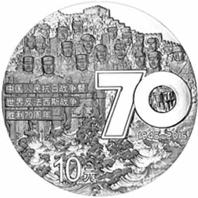 31.104克(1盎司)圆形银质纪念币背面图案为代表全民族抗战的人物群雕造型与长城、浪花、数字“70”与时间“1945-2015”共同组成标志性符号的组合设计,并刊“中国人民抗日战争暨世界反法西斯战争胜利70周年”字样及面额。
