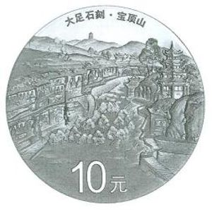 30克圆形银质纪念币背面图案为“宝顶山”景观造型,并刊“大足石刻·宝顶山”字样及面额。