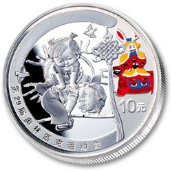 银币共同正面图案为中国传统对龙造型、第29届奥运会会徽和国名、年号。 银币背面图案以生动活泼、造型可爱、引人入胜的民间儿童体育游戏为内容,分别采用“放风筝”、“跳山羊”、“滚铁圈”、“踢毽子”四个典型的儿童体育游戏主景为币面主题,儿童游戏动作夸张有力,姿态优美,犹如朝阳蒸蒸日上,体现了奥林匹克精神永远向上、世代相传的深刻内涵。画面右侧1/3处用“中国结”来分割,右翼分别配置纸风车、泥塑兔儿爷、双鱼挂饰、布艺老虎等彩色玩具造型,活力四溢。