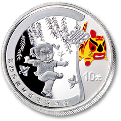 该枚币反映了儿童体育游戏——踢毽子。币面右侧1/3处用“中国结”分割,同时在右翼配置了彩色玩具造型——布老虎。 踢毽子是我国民间一项历史悠久的传统体育活动,出现于二千年前的汉代,兴起于南北朝及隋唐时期。毽子一般用动物羽毛制造,踢毽子用脚等身体部位触击毽子,集趣味性、普及性和简单性于一身。 银币的背面图案设计有4个特点:1、全套币面图案以中国传统民俗文化饰物“中国结”来分割币面构图;2、币面均为局部彩色印制民俗装饰图案;3、币面构图统一形式和风格,但又有规律性的左右变化;4、币面造型动态与静态相互间隔,有节奏感。整套银币画面轻快,造型活泼,加之缤纷的局部彩色工艺,使人耳目一新。