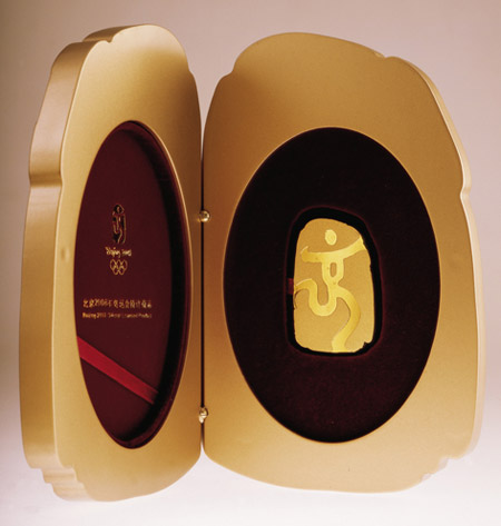 五福临门奥运贺岁金采用2008年北京奥运会会徽“中国印”形状为产品正面,采用浅浮雕工艺精密压制成型,辅助镜面压光、喷砂等工艺;另一面是由第29届奥林匹克运动会吉祥物 “福娃”组成的“五福临门”图案,采用高浮雕工艺精密压制成型,辅助镜面压光、喷砂等工艺。