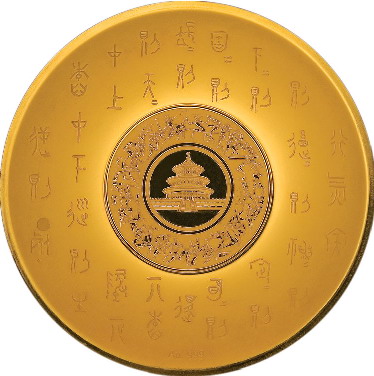 又是天坛,曾经无数次在贵金属纪念币上看到的天坛,亦同样出现在金盘的背面,周围图案为现代体育装饰图案和天津历史博物馆所藏距今2500多年前的最早的养身气功文物《行气铭玉杖首》铭文。正面的古代体育造型,背面的现代体育装饰图案,历史长河在这里融合交汇了,从远古缓缓流淌而来,汹涌磅礴地又朝向未来,大气却又精巧的构思。