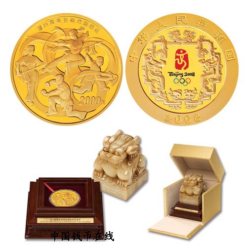 (3)5盎司金质纪念币背面图案为中国传统武术运动和奥运五环抽象造型,并刊“第29届奥林匹克运动会”中文字样及面额。