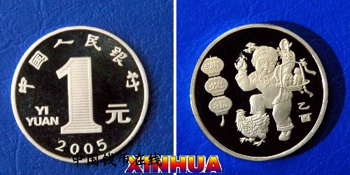 1月26日,中国人民银行发行2005年贺岁普通纪念币一枚。 纪念币正面(左图)刊“中国人民银行”、“1元”和汉语拼音字母“YIYUAN”字样及“2005”年号;背面(右图)主景图案为:身穿中国传统服饰的儿童左手提着装有两只雏鸡的篮子,右手举着一只蚂蚱,其下方为一只母鸡。左侧为书有“满堂福”的迎春灯笼,右下方为“乙酉”字样。