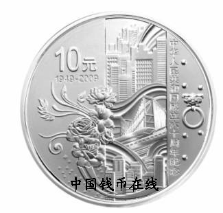 面额(元) 材质 成色(%) 质量 重量(oz) 形状 直径(mm) 最大发行量(枚) 10 银 99.9% 精制 1 圆形 40 100000 正面图案 中华人民共和国国徽衬以牡丹花纹饰组合设计,并刊国名、年号。 背面图案 开启的大门、城市建筑、高速列车、大桥等造型和盛开的鲜花组合设计,并刊“中华人民共和国成立六十周年纪念”、“1949-2009”字样及面额。 - ::商品简介::