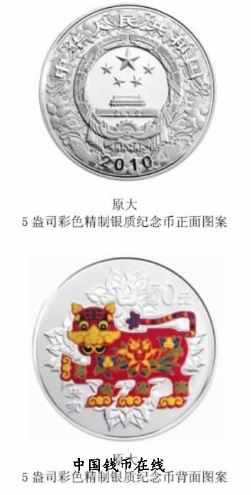 面额(元) 材质 成色(%) 质量 重量(oz) 形状 直径(mm) 最大发行量(枚) 50 银 99.9% 精制 5 圆形 70 8800 正面图案 中华人民共和国国徽衬以连年有余吉祥纹饰,并刊国名、年号。 背面图案 民间传统装饰虎造型衬以吉祥花卉图案(局部彩色),并刊面额 - ::商品简介::