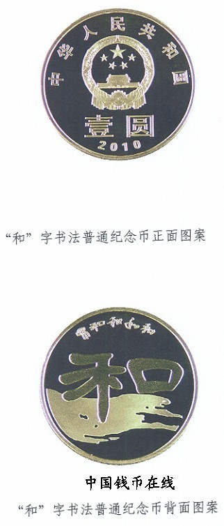 该普通纪念币正面图案为国徽,其上方刊“中华人民共和国”国名,下方刊“壹圆”面额和“2010”年号;背面主景图案为隶书“和”字,上方为多种字体书写的“和”字,背景以书法的飞白手法衬托。此次发行的“和”字书法普通纪念币面额均为1元,直径均为25毫米,材质均为黄铜合金,发行数量各1000万枚。