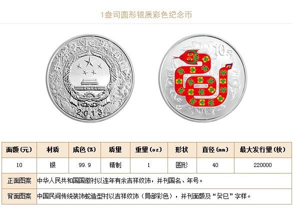 名 称:1/10盎司圆形金质彩色1盎司圆形银质彩色纪念币为精制币癸巳蛇
