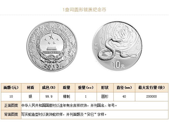 1/10盎司圆形金质1盎司圆形银质纪念币为精制币癸巳蛇详细资料