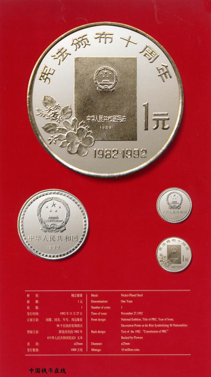 - 正面图案为中华人民共和国国名、国徽、年号,背面图案则是鲜花衬托下的1982年《中华人民共和国宪法》文本,“宪法颁布十周年”及“1982-1992”主题文字,面值。