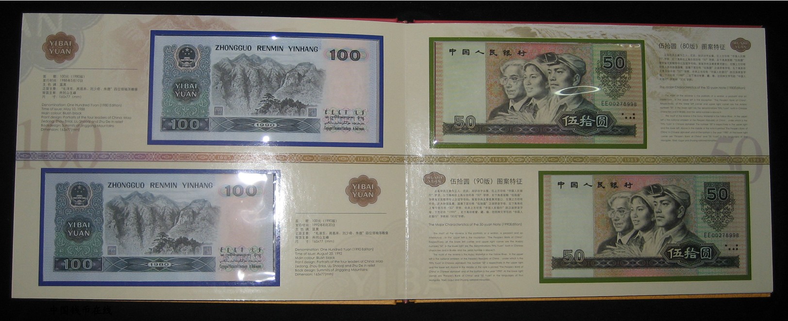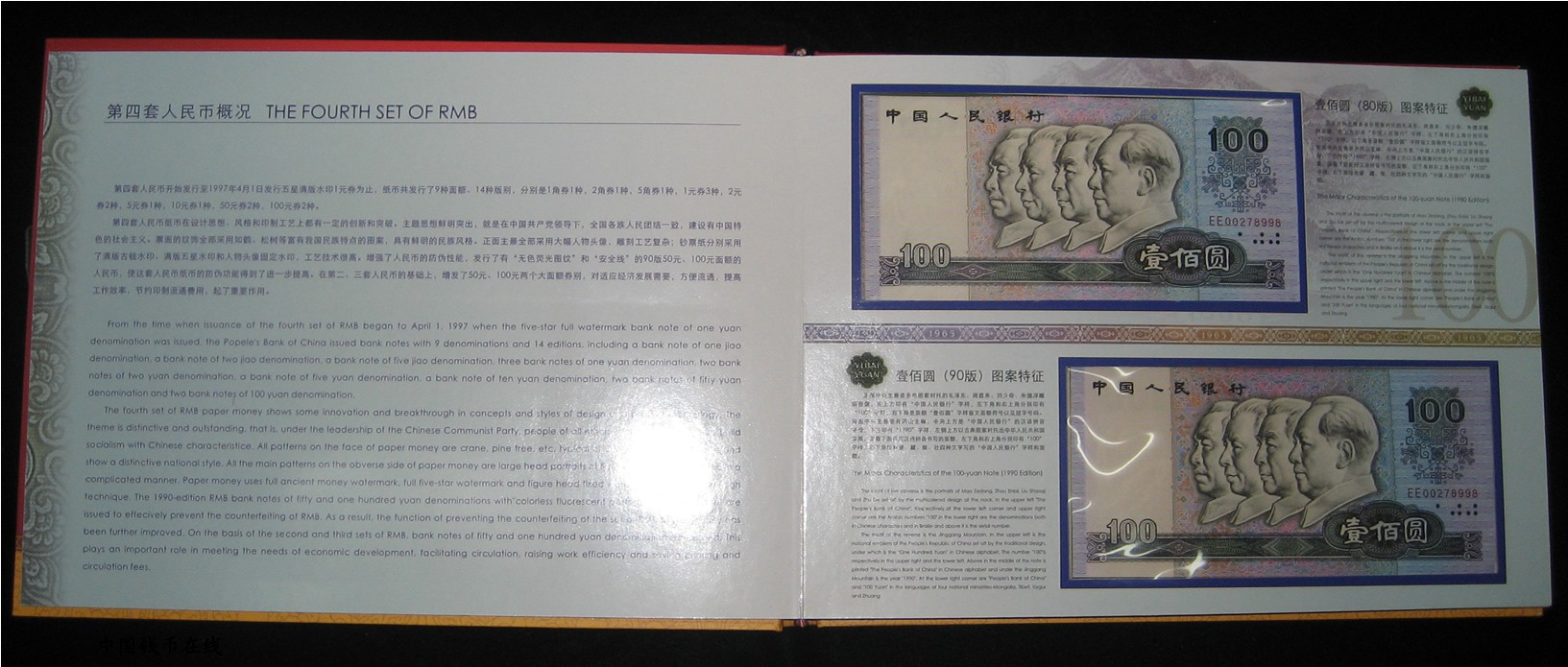 第四套人民币简介 第四套人民币从1987年4月27日开始发行,至1997年4月1日止,共发行9种面额,14种票券。其中1角券1种,2角券1种,5角券1种,1元券3种(1980、1990、1996),2元券2种(1980、1990),5元券1种;10元券1种,50元券2种(1980.1990),100元券2种(1980、1990)。 第四套人民币是筹划设计时间最长的一套人民币,从1967年1月总行提出设计第四套人民币的设想,到1985年5月定案,历时18年,这期间经历了曲曲折折,排除了各种极左干扰,最终避免了第四套人民币在设计上的灾难。 1967年1月,中国人民银行总行向国务院反映了湖北机械学院部分群众对人民币1元券天安门上没有毛主席像、红旗和标语提出尖锐批评的情况,同时提出了新版人民币的设计设想。2月,李先念批示:“应准备一套新版人民币,设计图景要多反映些生产关系方面的题材,克服第三套人民币生产力题材多的问题。”1968年7月16日,总行第一次向国务院报送新版人民币设计方案初稿,主要以“三突出”(突出毛主席的光辉形象、突出毛泽东思想、突出毛主席的革命路线)和“两个反映”(反映无产阶级文化大革命、反映社会主义革命和建设)为主题思想,当时受到周总理的严肃批评。1969年4月8日,总行第二次向国务院上报新版人民币设计稿,票券画面主要是反映极左的内容,仍未获批准,后因林彪反党集团覆灭而作罢。1975年11月18日,财政部(当时中国人民银行与财政部合并)第三次向国务院上报设计印制新版人民币的报告,设计方案的图稿主要反映社会主义新生事物和工农兵形象,如知识青年上山下乡、工农兵上大学、农业学大寨、工业学大庆等,同年12月29日李先念批示:“放一放再说。”1976年5月10日再次请示,李先念批示:“暂时不办。”以上上报的三套方案内容均是“文化大革命”极左思想的反映,由于在党中央、国务院的正确路线指导下,均被一一排除,使极左思潮未能反映在国币上。 粉碎“四人帮”以后,1977年11月15日,财政部再次上报关于设计新版人民币的报告,详细陈述了设计新版人民币的必要性和可能性,很快于11月21日获党中央政治局审查批准。1978年4月,根据党中央国务院的决策,中国人民银行总行首先组织印制系统专业技术人员进行研究,同年11月,在中央美术学院和中央工艺美术学院领导的支持下,在罗工柳主持下,由周令钊、侯一民、邓澎、陈若菊等组成专家组,在印制系统专业设计雕刻专家张作栋、石大振、刘延年等参与下,开始重新设计第四套人民币。经过专家们集思广益,确定了设计指导思想和设计思路,最后完成设计方案。1979年12月8日,总行上报第四套人民币彩色设计稿(当时没有50元和100元券),12月20日经国务院原则批准。1983年2月24日,总行向国务院上报关于印制发行第四套人民币的报告,同年3月3日国务院核准印制。 就在第四套人民币设计过程中,1981年7月6日,总行就根据市场货币流通量猛增的实际情况,指示设计3种大面额票券,即20元、50元、100元,由北京印钞厂设计为以泰山、新华门,人民大会堂、三峡,天安门、长城为正背面主景的3种票券。11月4日总行正式上报关于印制发行3种大面额票券的报告,详细陈述理由,但此件未被批准。1984年2月29日,总行再次上报印制大面额票券的报告,3月4日国务院批示:“同意付印,何时发行另行报批。”10月23日总行上报关于公布新版人民币时间及改变大面额票券设计主题的请示,陈述了原设计3种大面额票券与批准的1角至10元券设计主题不一致,重新组织专家设计,并取消20元券,50元正面用工人、农民、知识分子头像,背面用黄河图,100元正面用毛泽东、周恩来、刘少奇、朱德四位领袖像,背面用井冈山全景,并将两张票券作为第四套人民币的配套面额。1985年5月,国务院常务会议讨论批准。至此,第四套人民币整套设计完成。 第四套人民币在票面的设计风格和印制工艺上较前三套人民币都有创新和突破,既吸收了国外钞票设计的某些艺术特点,又保持并发扬了我国民族艺术的传统,不仅有实用价值,而且具有很高的艺术价值。 1.图案设计特点。人民币是我国的法定货币,因此,画面的设计从政治上说要庄严,体现出人民当家做主的含义,体现各族人民的大团结,从形式上说要有中国的民族特点,要有较高的艺术性,同时还要适应形势,体现出国家的发展变化,表现出社会主义建设和科学技术新成就。第四套人民币的图案设计充分地体现了这些特点,这套人民币整套票券设计思想的共同主题是:全国各族人民在中国共产党的领导下,精神焕发,为建设社会主义现代化国家而努力奋斗。为了表现和强调这一主题,票面采用大幅人物头像为主景,这是目前国际上常用的手段,具有较好的防伪效果。100元券采用四位领袖浮雕像,这不但是我党始终坚持的马列主义毛泽东思想的形象表现,同时也记录和歌颂了党领导中国革命的光辉历史;50元券正面主景是工人、农民、知识分子头像,体现了我国宪法规定的“中华人民共和国是工人阶级领导的、以工农联盟为基础的人民民主专政的社会主义国家”和“社会主义的建设事业必须依靠工人、农民和知识分子,团结?一切可以团结的力量”的国体和政权性质;从10元券开始到1角券,正面主景都是我国有代表性的民族人物头像,每张票面两人,栩栩如生。这些民族人物头像是多民族国家的象征,不仅反映了我国各民族的大团结,而且反映了各族人民意气风发、斗志昂扬