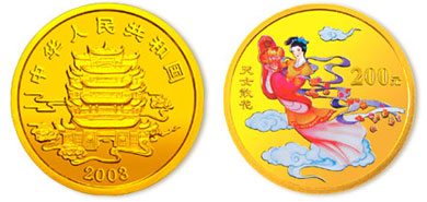 - 该套彩色金银纪念币正面图案均为琼台楼阁图,并刊国名、年号。 背面图案为天女散花,并刊面额。