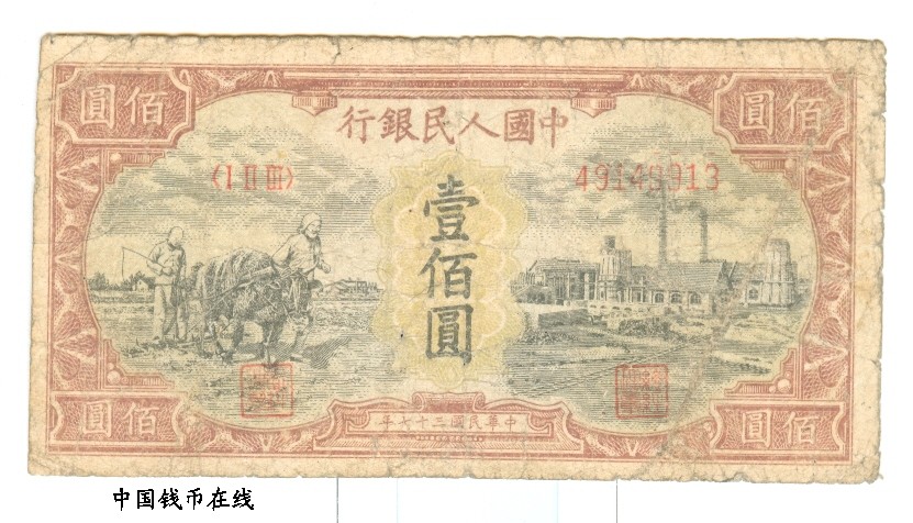 名 称:第一版人民币100牛耕地与工厂