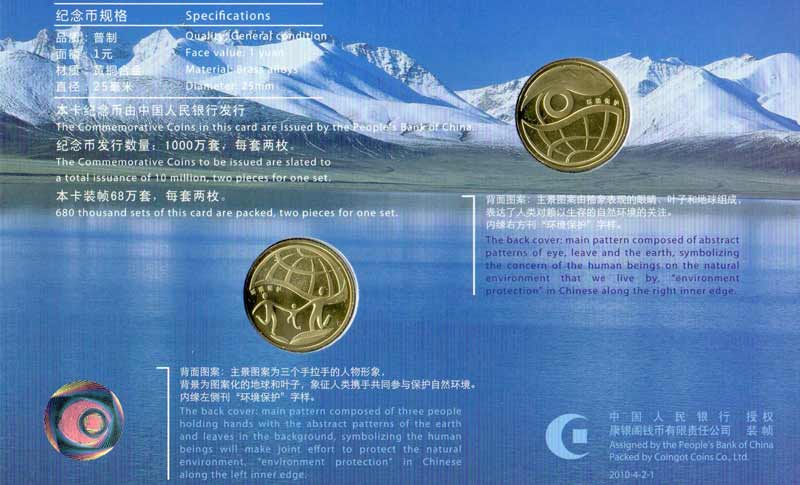 二组,正面图案为国徽,其上方刊“中华人民共和国”国名,下方刊“壹圆”面额和“2010”年号;背面主景图案为三个手拉手的人物形象,背景为图案化的地球和叶子,象征人类携手共同参与保护自然环境,内缘左侧刊“环境保护”字样