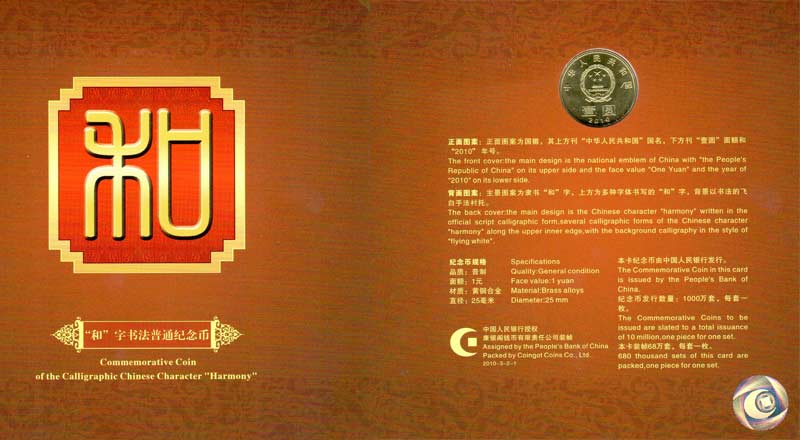 正面图案为国徽,其上方刊“中华人民共和国”国名,下方刊“壹圆”面额和“2010”年号;背面主景图案为隶书“和”字,上方为多种字体书写的“和”字背景以书法的飞白手法衬托