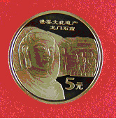 世界文化遗产——龙门石窟普通纪念币背面主景图案为龙门石窟中最大的佛像——卢舍那大佛,其背景为奉先寺中的天王、力士。内缘上方刊“世界文化遗产龙门石窟”字样,内缘右下方刊“5元”字样。