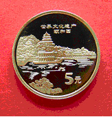 世界文化遗产——颐和园普通纪念币背面主景图案为颐和园万寿山和佛香阁,其前景为昆明湖和湖上的石舫。内缘上方刊“世界文化遗产颐和园”字样,内缘右下方刊“5元”字样。