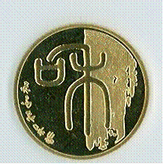 该普通纪念币背面主景图案为篆书“和”字,左下方为以多种字体书写的“和”字,背景以书法的飞白手法衬托。