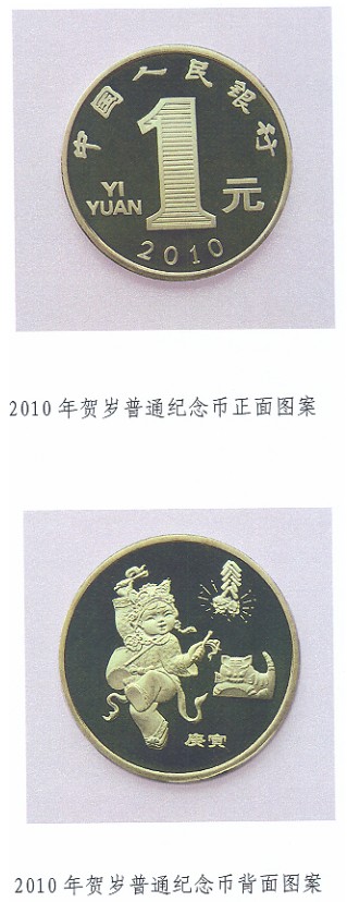 2010年贺岁普通纪念币面额为1元,直径为25毫米,材质为黄铜合金,发行数量3000万枚。
