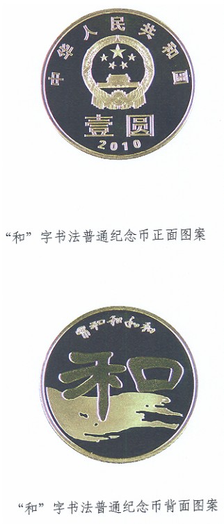 该普通纪念币正面图案为国徽,其上方刊“中华人民共和国”国名,下方刊“壹圆”面额和“2010”年号;背面主景图案为隶书“和”字,上方为多种字体书写的“和”字,背景以书法的飞白手法衬托。
