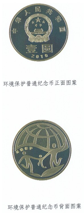 该普通纪念币正面图案为国徽,其上方刊“中华人民共和国”国名,下方刊“壹圆”面额和“2010”年号;背面主景图案为三个手拉手的人物形象,背景为图案化的地球和叶子,象征人类携手共同参与保护自然环境,内缘左侧刊“环境保护”字样。