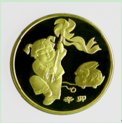 该普通纪念币背面主景图案为手举风车的小女孩和兔灯,内缘下方刊“辛卯”字样。