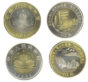 正面图案为国名、澳门特别行政区区徽、年号。背面图案则是1、特别行政区基本法2、澳门风景。