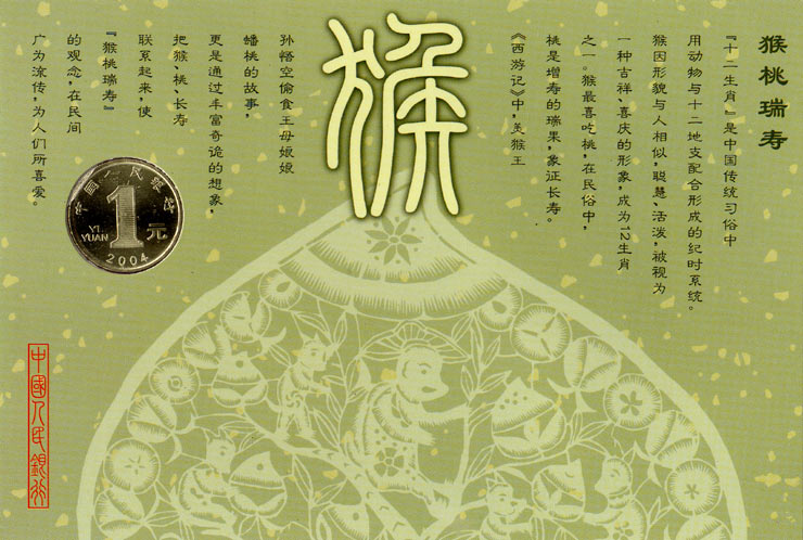正面刊“中国人民银行”、“1元”和汉语拼音字母“YIYUAN”字样及“2004”年号;背面主景图案为:身穿中国传统服饰的儿童放飞带有孙悟空图案的风筝,背景为装饰性的风的线条,内缘右上方刊“甲申”字样。