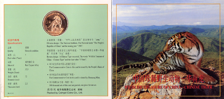 纪念币背面图案:站在岩石上的华南虎,“中国珍稀野生动物——华南虎” 币名及“5元”面值。