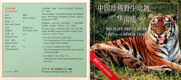 纪念币背面图案:站在岩石上的华南虎,“中国珍稀野生动物——华南虎” 币名及“5元”面值。