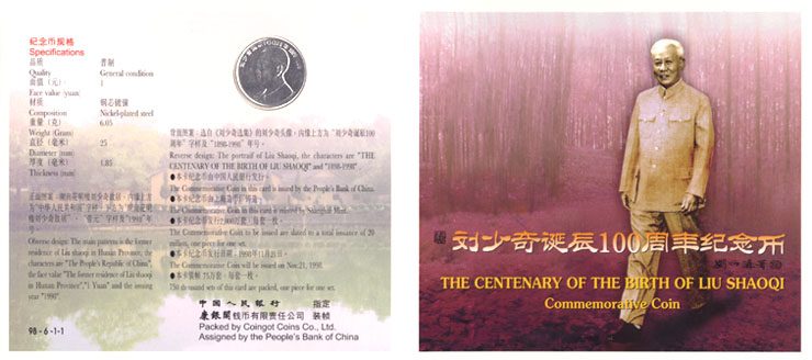 正面图案为国名、刘少奇故居、年号、面值。背面图案则是刘少奇肖像。