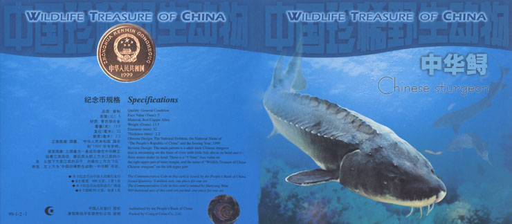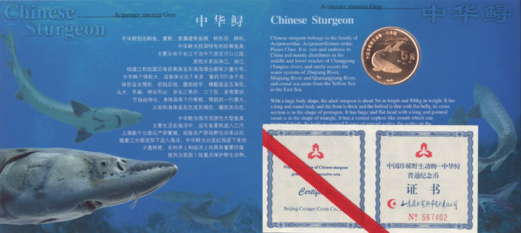 正面图案为国名、国徽、年号。背面图案则是水中畅泳的中华鲟、面值。