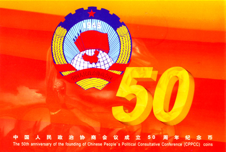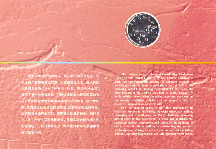 背面主景图案为全国政协会徽,会徽两旁有装饰花瓣,内缘下方依次为中 国人民政治协商会议胜利50周年字样及“1949-1999”年号。