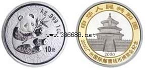 中国人民银行定于10月30日发行广州国际邮票钱币博览会纪念银币的正面图案为北京天坛祈年殿、国名、年号及“2000广州国际邮票钱币博览会纪念”字样,背面图案为大熊猫及面额。这套银币每枚含纯银1盎司,面额10元,共发行40000枚。