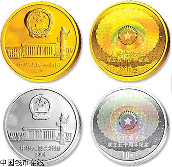 金币——正面图案:国徽、北京人民大会堂和华表图案,并刊国名、年号 背面图案:北京人民大会堂天穹灯饰图案(幻彩)及“人民代表大会成立五十周年”中文字样,并刊面额。银币——正面图案:国徽、北京人民大会堂和华表图案,并刊国名、年号 背面图案:北京人民大会堂天穹灯饰图案(幻彩)及“人民代表大会成立五十周年”中文字样,并刊面额。
