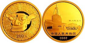 该枚金币正面图案为四川三星堆博物馆馆景,并刊国名、年号。背面图案为青铜纵目面具,并刊面额。