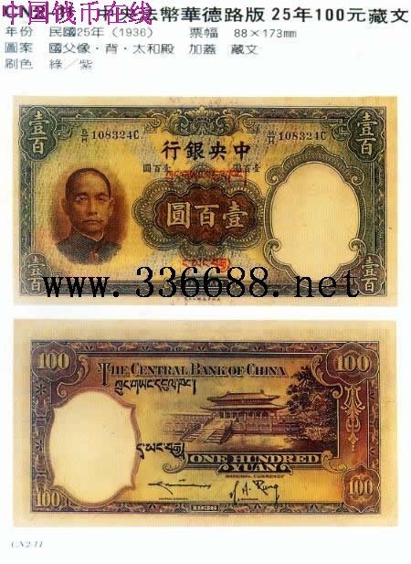 中央法币华德路版   25年100元藏文